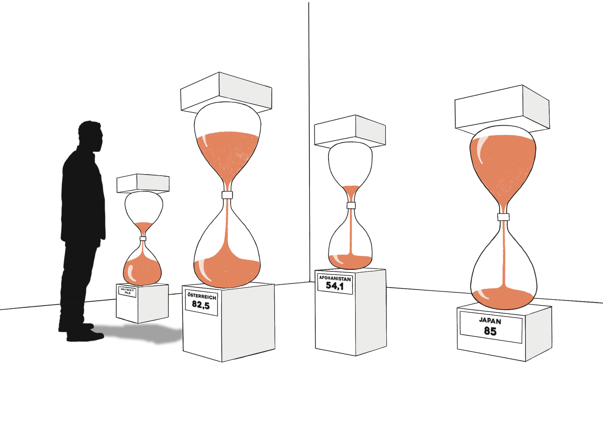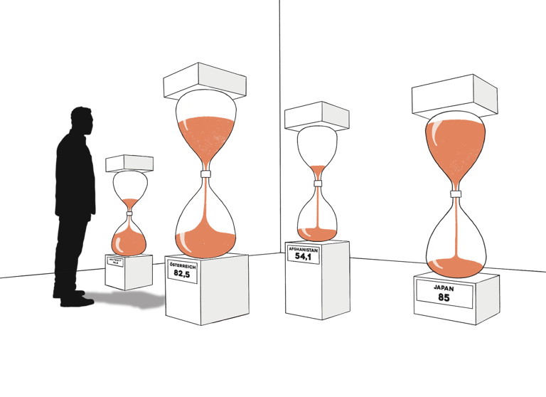 Oversized hourglasses with different run times visualise variations in life expectancy across countries. The slowly flowing sand makes demographic disparities perceptible.