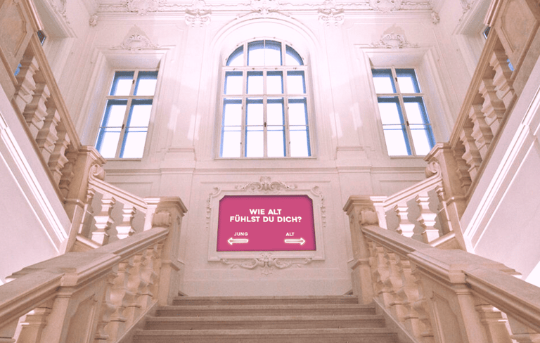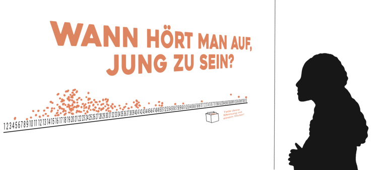 A wall-mounted timeline numbered 1 to 100 invites visitors to mark with adhesive dots when they think youth ends. The accumulating responses make individual perceptions of aging visible as a collective pattern.