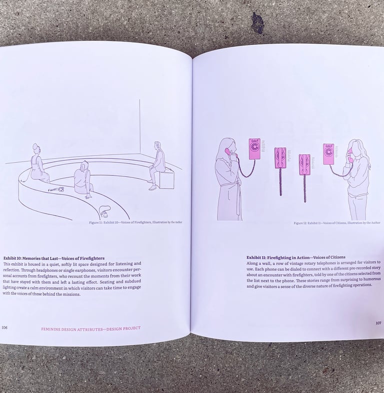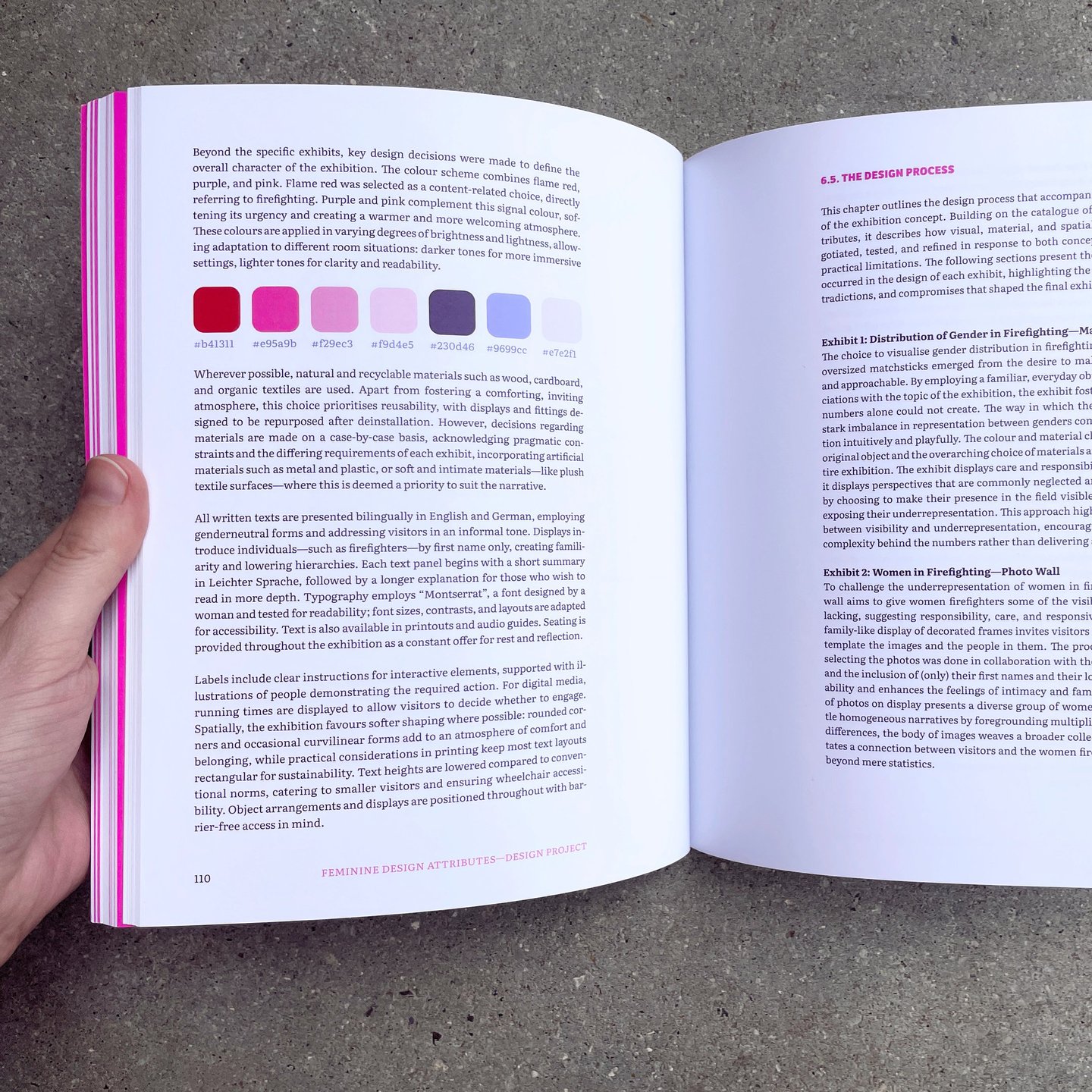 For the practical component, I conceived a temporary exhibition about firefighting, reframing this traditionally male-coded field through a consciously feminine lens across thirteen stations. The project strengthened my understanding of how exhibition design can influence narratives, perception, and belonging, and reinforced my commitment to feminist and socially engaged practice.