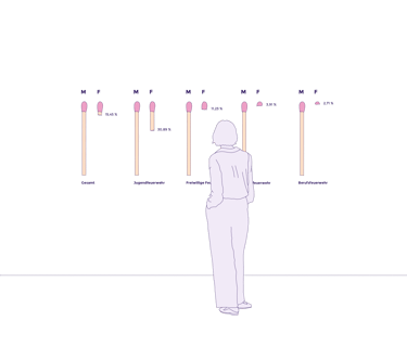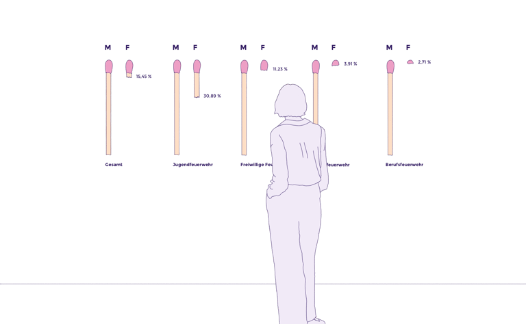A three-dimensional infographic made from paired matchsticks visualises gender distribution in the German firefighting service. The tactile format turns abstract statistics into an immediate, spatial experience of imbalance.