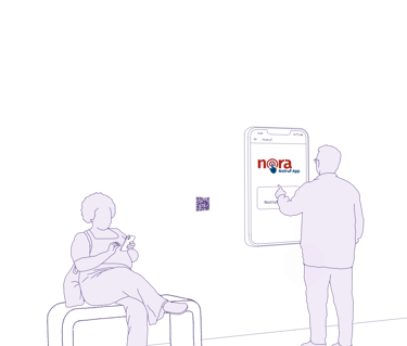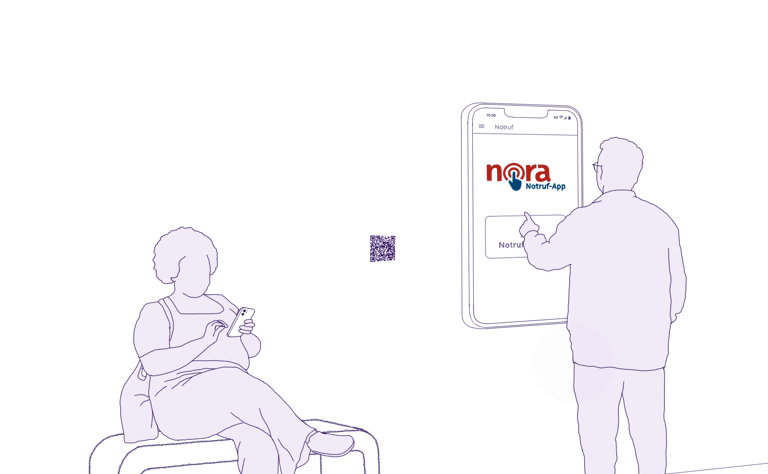 An oversized smartphone introduces visitors to the German “nora” emergency call app. The interface can be explored directly on the object or via QR code on personal devices, combining clear interaction with accessible information.