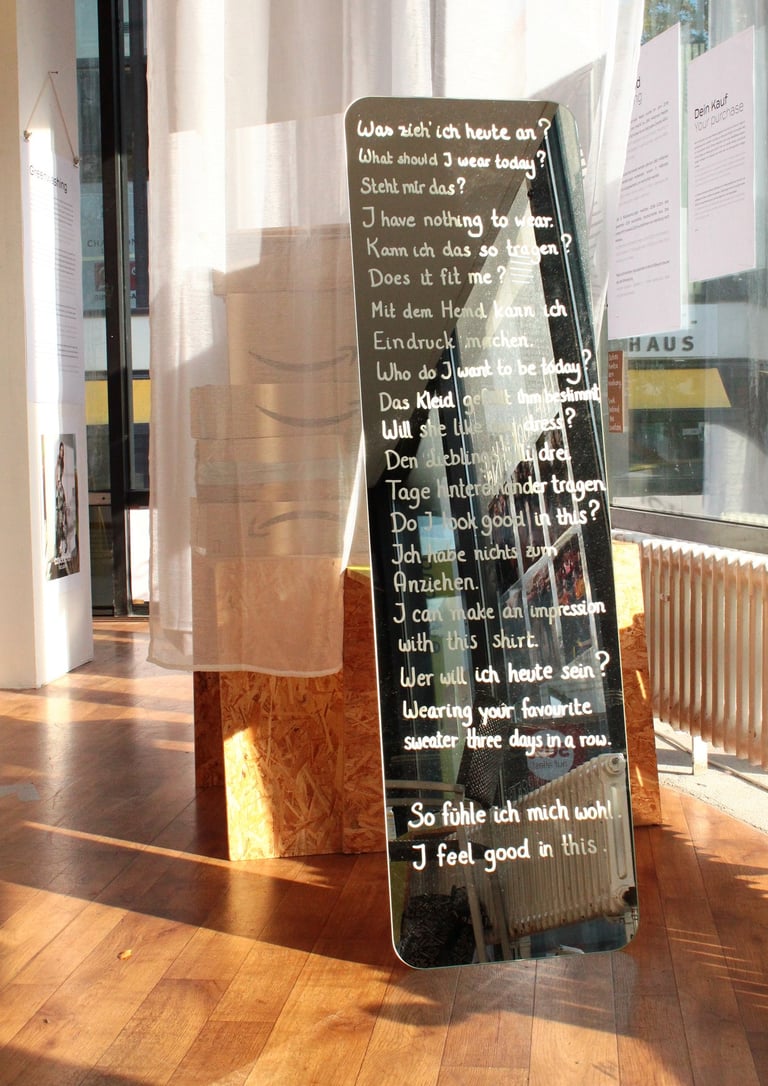 Umkleiden engaged visitors in a reflection on their own clothing choices within broader cultural, ethical, and political systems. The exhibition used wardrobe metaphors as a visual and conceptual entry point to explore sustainability, cultural appropriation, and consumer responsibility within global systems of production and identity.